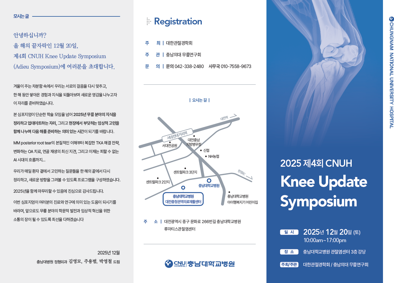 2025년 한 해를 마무리하는 12월, 충남대학교병원 정형외과에서 제4회 CNUH Knee Update Symposium (Adieu Symposium)’을 개최합니다.