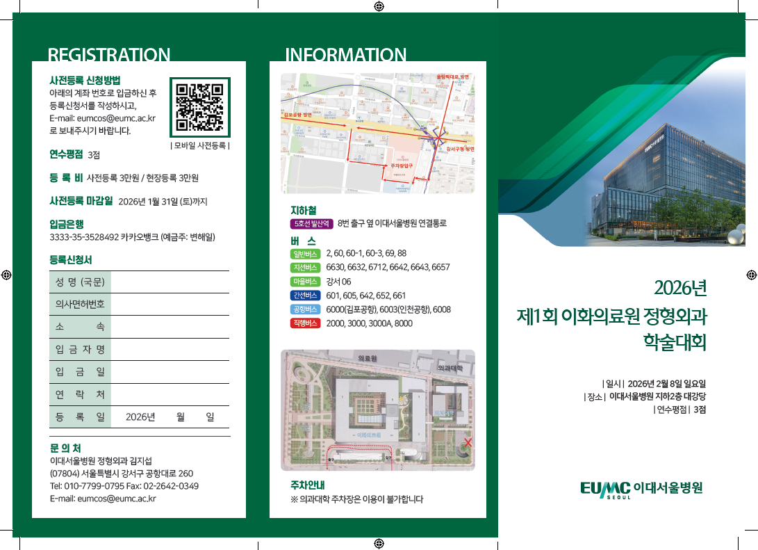국내 학술행사 이대서울병원 정형외과 제1회 이화의료원 학술대회 학회사무실 2025-12-15 조회수 : 421 Link URL : 행사명: 제1회 이화의료원 정형외과 학술대회 사전등록 홈페이지: https://eumc.bjsolution.kr/register/2026_01/entry/write.html 행사 날짜: 2026년 2월 8일(일요일) 첨부파일 [최종]서울병원 제1회 이화의료원 정형외과 학술대회.pdf (다운 9건) 목록