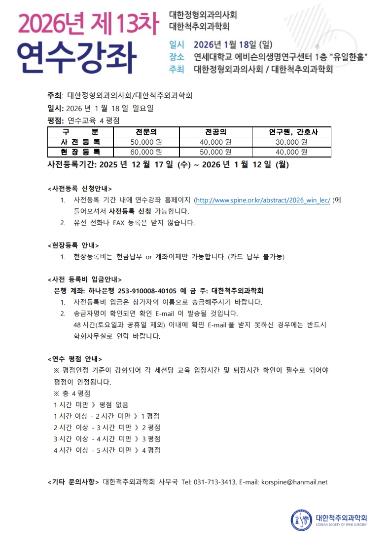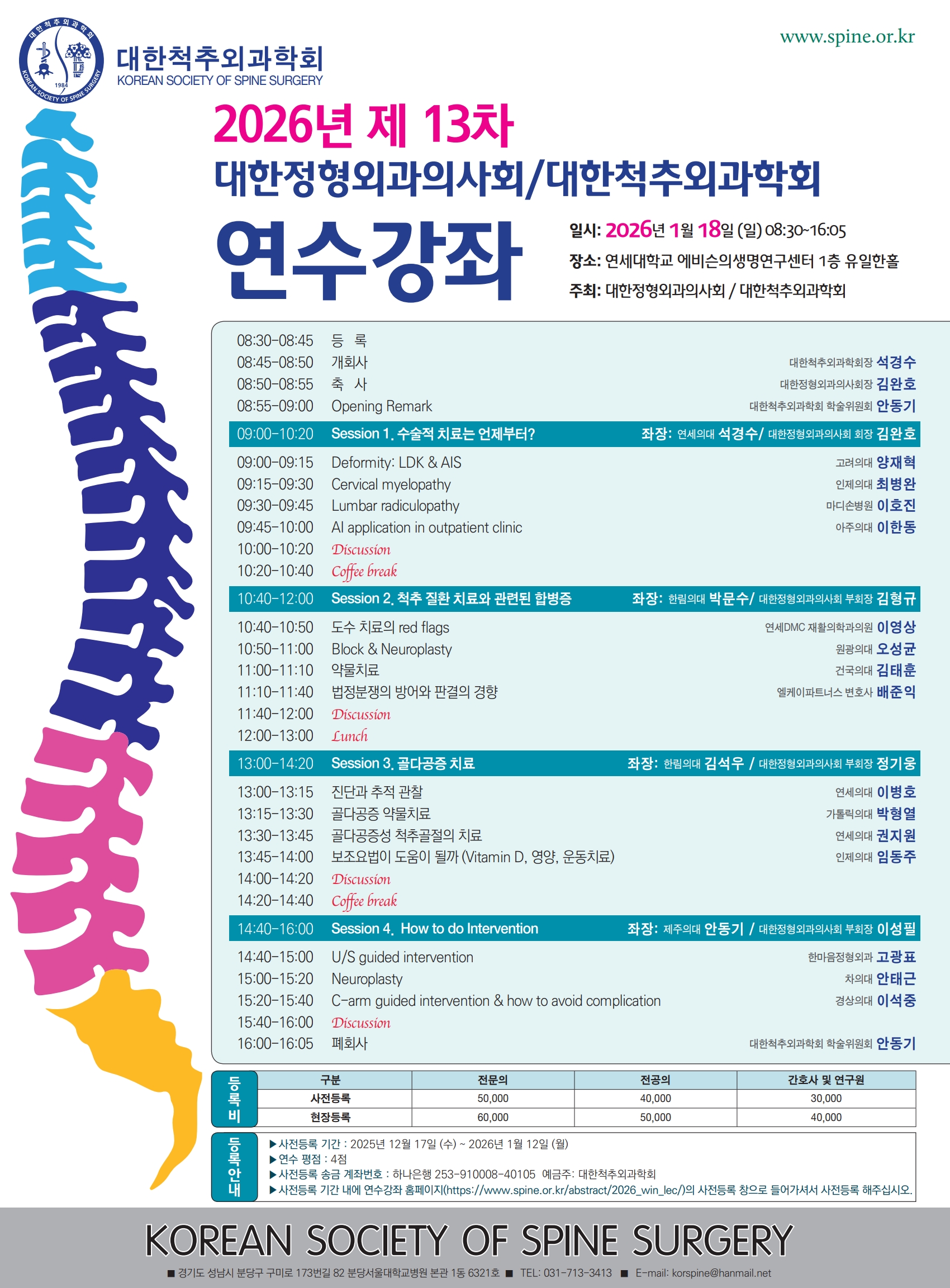 국내 학술행사 2026년 제13차 대한정형외과의사회- 대한척추외과학회 연수강좌 사전등록 및 개최 안내 학회사무실 2025-12-22 조회수 : 350 Link URL : http://www.spine.or.kr/abstract/2026_win_lec/ 첨부파일 2025년 제13차 대한정형외과의사회 - 대한척추외과학회 연수강좌 개최 및 사전등록 안내_2.jpg (다운 5건) 2025년 제13차 대한정형외과의사회 - 대한척추외과학회 연수강좌 개최 및 사전등록 안내_1.jpg (다운 7건) 목록
